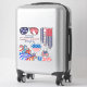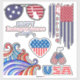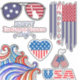 Sju olika illustrationer med rött vitt och blått patriotiskt Independence day och bilder, inklusive Biden stil aviator-glas, ett lodrät flagga, hundbrickor, hjärta och snurrar