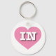 Den här nyckelringen har ett pulserande rosa-hjärta som innehåller fetstil, vit, övre breven fodral IN, förkortningen officiell för Indiana, hoosiertillståndet.