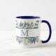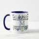 Du kommer att visa den här söt personlig kaffet mugg på kontoret! Den har en mönster av indigo blue och grönt löv och fern bilder skapar gräns för ditt monogram i mitten. Monogrammet och bilder placeras på vit bakgrund och upprepas på andra sidan mugg.