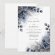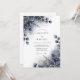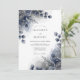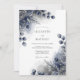 This design showcases a moody indigo and slate watercolor palette. Artistic botanical illustrations of eucalyptus leaves, winter berries, and lush roses surround a soft misty wash. The atmospheric aesthetic captures a cold, serene seasonal feel through delicate nature-inspired textures and deep blue tones.