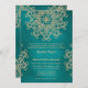 En vacker turkos påfågel blågrön JUVELTONAD och guld bröllopsinbjudan med ett exotiskt indiskt inspirerat ornamentalt sari-MEDALJONG mönster MED EN BLOM- OCH LOTUSSOL DESIGN. Denna eleganta och vackra lyxiga moderna indiska bröllopsinbjudan är perfekt för alla formella tillfällen MED EN ÖSTASIATISK INDONESISK MAROCKANSK ALADDIN ELLER TUSEN OCH EN NATTS TEMA. Designad av Chrissy H. Studios, LLC. Alla rättigheter förbehållna.