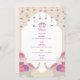 Indiska Elegance Med den här spännande bröllop-menyn blandas kulturella motiv med ett modernt estetiskt, skapar ett mönster som är både traditionellt och contemporary. Inbjudan innehåller en mjuk beige bakgrund med känsliga blommönster, som symboliserar elegans och harmoni. Fokuseringen är de pulserande, dekorativa elefanterna, som tillför ett inslag av kulturarv och festlighet i lila och orange. Den ornatbåge som ligger högst upp och de vita blommigtarna skapar en varm och inbjudande atmosfär. Skriptteckensnittet för namn ger elegans, medan det klassiska serif-teckensnittet ger enkel läsbarhet för detaljerna. Idealisk för ett kulturellt bröllop eller ett destinationsbröllop, fångar inbjudan kärlek och firande innersta väsen. F007