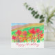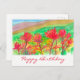 Ett vykort i blommigt grattis på födelsedagen med levande röda, indiska penselsnäckor som växer på sluttningarna av en högtrad med lugn blå himmel i den avstånd med vattenfärg.