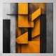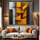 Abstrakt komposition med överlappande geometriska paneler i metallisk orange, svart och betonggrå. Slitna industriella texturer skapar djup och visuell dramatik. Modern arkitektonisk design idealisk för samtida inredning, kontor eller urbana utrymmen. Ge visuell inverkan och industriell sofistikation till din miljö med detta unika konstverk.