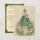This prayer card features the Infant of Prague clothed in rich emerald green, surrounded by shamrocks, white lilies, and ivory roses in a softly painted vintage devotional style. The sacred image evokes Ireland’s deep Catholic heritage and the mystery of the Most Holy Trinity symbolized by the shamrock.