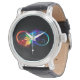 Artistically drawn infinity symbol with beautiful rainbow feather on white background. Tattoo style.