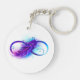 Infinity symbol with a beautiful feather painted in purple and blue bright colors on white background.