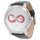 Infinity symbol of continuous stream of red wine pouring into glass wine glass on white background.