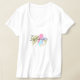 This image features a white V-neck t-shirt with the word "Influencer" printed on it in a stylish, cursive font. Below the main word, in a smaller font, it says "is always on trend". The text is overlaid on a background of abstract, colorful brush strokes in shades of green, pink, and blue, with some black speckles. The t-shirt is worn by a person, showcasing its design and fit.