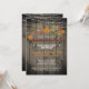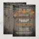 Rustika inbjudningar till husvärmningsfest med lantlig prägel, lada trä och lampkedjor - Väderbitna, slitna gamla brädor från ladan i bakgrunden med mörka kanter. Gnistrande lampkedjor pryder toppen. Läser 'Vänligen kom och delta i vår husvärmningsfest' i höstens bruna röda med skuggeffekt. Ovanför syns en display med höstlöv i grönt, rött, brunt och gult. En elegant ram i form av en pergamentrulle skiljer introduktionen från festdetaljerna. Baksidan har samma rustika träbakgrund med lampkedjor. Obs: Alla bilder är tryckta. Använd knappen Anpassa för att ändra något - typsnitt, storlek, färg eller placering. Vackra rustika inbjudningar med lantlig prägel för rustika teman, husvärmningsfester på landet, utomhus husvärmning eller husvärmningsfirande under hösten. Vi har samord