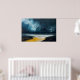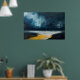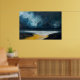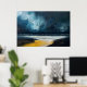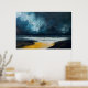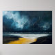 Denna dramatiska abstrakta havsutsikt fångar den laddade stillheten strax innan en storm bryter ut. Mörka, turbulenta moln rullar tungt över himlen, målade i djupa nyanser av marinblått, skifferblått och kol, medan fina gyllene linjer spricker genom atmosfären som avlägsna blixtar. Nedan ligger havet oroligt men återhållet, dess bleka, reflekterande yta möter en glödande rand av gyllene strandlinje som känns både lugn och illavarslande.