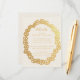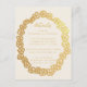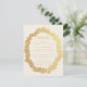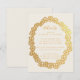 Ett kort med uppgifter om bröllop med texten i en grov ovala blommigt ram, en blomkrans för faux guld. Texten är gyllene, precis som blommigten ram. Titelinformationen skrivs i skript, resten i versaler. Bakgrunden är elfenben (nästan vit). Blommor kommer från det gamla bok-täcket av bok-morötter från 1895 av Molesworth, som nu är offentligt.