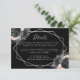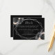 Den här eleganten har ett kort för modern bröllop-detaljer med ett silver-geometriskt ram som är dekorerat med persiko-, svart- och silver-blommor och silver faux glitter mot svart bakgrund. I anpassadet kombineras silver grått med vismisk handskrift och kopparplåt typsnitt. Den omvända sidan är helsvart.