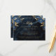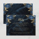 Kortet i elegant bröllop innehåller detaljer om blått blommigt, som är uppkopplat med guld faux foil grey i två hörn, på en bakgrundsbild av marint blått vattenfärgagat. Anpassadet kombinerar guld-färgad serif, italic och handskriftsformat typsnitt. Den omvända sidan har en matchande marin blå och guld-blommigt och agate-design.