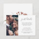 Den enkla gästdetaljen i bröllop har söt skripttypografi och ett foto på framsidan och vackra terracotta-persikor, plommon och vita blommor och löv på baksidan. Visa den här insamlingen av bröllop för trendig för samordning av sändningstillbehör.