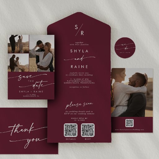 Kortet för den burghunniga röda bröllop-chicen är perfekt för ett minimalistiskt bröllop. Den mörk maronens vin röda, moderna bohemiska design har en enkel, rustisk kalligrafi med ett unikt men klassiskt stil.