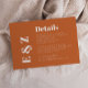 Kortet i bröllop innehåller titeln "Detaljer" och parets monogram initialer i fet, minimalistisk typografi, med den återstående texten i ett vitt modernt sans serif-teckensnitt på en brinnande orange.