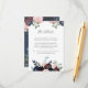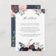 Dessa vackra bröllop-gästkort har vackra, trendig marblått, plommonfärgad lila och vattenfärgblommor i rosa och botaniska löv och löv i grönt. Texten är en blandning av ett modernt "slab" och "elegant"-kalligrafi i marinen, på vit bakgrund. Kortets baksida har mer blommigt i elegant på en passande mörk blått bakgrund. Du kan använda dessa kort för köranvisningar, mottagnings- eller transport-information, hotell- eller inkvarteringsinformation och alla andra bröllop-uppgifter som du behöver dina gäster för att veta.