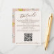 Förbättra din bröllop-svit med vårt vackert utformade visitkort för detaljer. Det här kortet kombinerar sömlöst modern elegans med lite stollig. På framsidan finns gott om utrymme för all nödvändig information, medan baksidan är försedd med delikata vattenfärger i nyanser av rosa, persika och vitt. Perfekt för att dela platsens information, logi och mer, med det här kortet ser till att dina gäster får all information de behöver på ett charmigt och snyggt sätt. Du kan till och med lägga till en QR-kod för att enkelt kunna dirigera frågor till din OSA eller bröllop webbplats.
