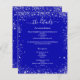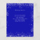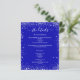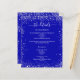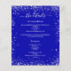 Ett modernt program/detaljer/tidslinje för elegant bröllop. En blå färgad i royalet som dekoreras med faux silver glitter-gnistor. Anpassa och lägg till information om namn och bröllop. Vit färgad brev. Text på båda sidor. 1 lakan = 1 program tryckt kant till kant.