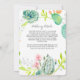 Den här versionen av inbjudan innehåller information om bröllop på motsatt sida. En andedräkt av kaktus och kulenter i blomning har blommor av mjuk rosa, persika och magenta tillsammans med löv tendrils i grönt och grått. Upphovsrätt alla höger förbehållna.