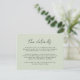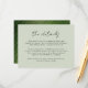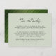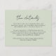 De här enkla, bröllop-snyggt--utrymmeskort har elegantens typografi, "detaljer" i svart över en bakgrund i anpassningsbar färg (visas i grönt för ljusavläsning). På baksidan finns en banandesign i löv, perfekt för en tropisk strand eller bröllop!