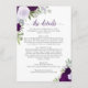 Det här vackra kortet för djurutrymme är designat för att ge dina gäster ytterligare information om mottagning, logi, researrangemang, register, webbplats, anvisningar eller andra specifika uppgifter som dina gäster kan behöva. Den har en vacker rustik boho-chic med lacy script calligraphy och handmålad vattenfärg ro i skuggor av dammig lila, lavender, plommon och violett.