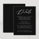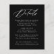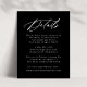 Vår Elegant Calligraphy bröllop-samling har ett vackert, vitt kalligrafiskript med svart bakgrund. Anpassa det här passande kortet för inneslutning i bröllop med viktiga bröllop-detaljer som hotellrum, bröllop webbplats, researrangemang, välkomstmottagningar och mycket annat. Kortet för svarta och vita bröllop-uppgifter är perfekt för både formellt och avslappnad bröllop under vilken säsong som helst.