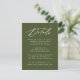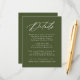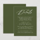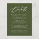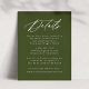 Vår Elegant Calligraphy bröllop-samling har ett vackert, modernt kalligrafiskript med oliv grönt riker. Anpassa det här passande kortet för inneslutning i bröllop med viktiga bröllop-detaljer som hotellrum, bröllop webbplats, researrangemang, välkomstmottagningar och mycket annat. Kortet för oliv grönt uppgifter om bröllop är perfekt för både formellt och avslappnad bröllop under vilken säsong som helst.