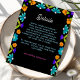 viktig bröllop-information i stil med den här Eleganten finns det ett minneskort för Fiesta Bröllop. Utformningen är deformerad med klara mexikanska inspirerade blommigtar i fet stil med rött, rosa, gult och orange och ger dig en fin charm till firande samtidigt som du behåller ett finare, sofistikerat utseende. Gravt typografi och ren layout säkerställer att dina detaljer, t.ex. logi, anvisningar eller klänningskod, är tydliga och väl presenterade. Perfekt för par som vill blanda ihop glatt kultursinne med tidlös elegans i varje inslag av sin bröllop-svit.
