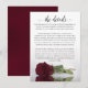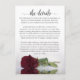 Det här vackra bröllop-kortet är designat för ge du extra för spelar ingen roll information som dina gäster kan behöva, inklusive webbplats, register, mottagning, resor, logi eller andra uppgifter. Kortet har en fantastisk utformning med en enda reflekterande burgundisk ro och en äldre skripttitel som läser "informationen". Baksidan är en marmorerad burgare, en maron eller vin röd färg.
