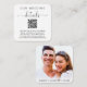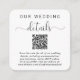 Kortet för omslutning i kvadrat med "detaljer" i ett skript för snyggt med dekortecken. Ange din bröllop webbplats adress för att skapa en QR-kod som dina gäster kan söka igenom för all information, t.ex. anvisningar och platser och för OSANS online. Baksidan innehåller ditt foto överlagrad med det första namn och bröllop-datumet gått med ihop av ett hjärta.