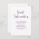 Det här enkla och snyggt gästinformationskortet har en vit bakgrund med elegantens lila typografi och ingår i vår "Modern Watercolor Blommigt"-samling i bröllop. Du kan använda korten så att de innehåller information om din bröllopsmottagning, köranvisningar, logi och allt annat du behöver för att få veta av dina gäster.