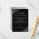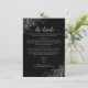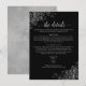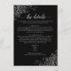Det här vackra kortet för djurutrymme är designat för att ge dina gäster ytterligare information om mottagning, logi, researrangemang, register, webbplats, anvisningar eller andra specifika uppgifter som dina gäster kan behöva. Har en enkel men ändå elegant-design med blek grått-text på svart bakgrund, en lacy-skripttitel och frilly silver faux-folier och snurrar i hörnen.