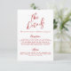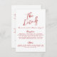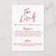 Kort för enkel handskriven Whimsical Red Bröllop-detaljkorg. Det här kortet i bröllop innehåller en enkel, minimalistisk design i ett rött tema med handskriven text för ett modernt och lättillgängligt utseende. Längst upp på framsidan visas "Detaljer" på en framträdande plats i ett stort handskrivet stil, där en roligt och en unik beröring läggs till. Det röda färg-systemet gör detta kort till ett utmärkt sätt att passa för nautiskt eller Nantucket-inspirerat bröllop, eller så kan det lätt blandas och matcha med andra inbjudningar med röda toner. Du kan byta färg till kostym på bröllop temat och preferenser, helt anpassade. Kortet ger utrymme för viktig information om bröllop, inklusive mottagningsdetaljer, attitydriktlinjer, logi, transport och ytterligare anteckningar eller en webbplats för bröllop. Perfekt för par tittar för att på ett rent och snyggt sätt kunna viktiga uppgifter med sina gäster. Det här kortet finns som en tryckt version eller en digital nedladdning för att få mer information.