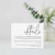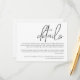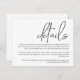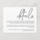 Det här enkla kortet för djurutrymme har minimal dragningskraft och modern utformning. Utformningen har "detaljer" i ord i handskriven ansikte av edgy contemporary. Detaljerna visas i ett krypset serif-format ansikte och är motiverade för högerna. Det ser ut som chic med en sympatisk fläkt. Använda det här kortet som ett hölje med dina bröllopsinbjudningar för att ge dina gäster i bröllop viktig information. Du kan inkludera information som hotellrum, transport-info, speciella händelser och aktiviteter, din webben i bröllop eller annan information som du vill inkludera. Om du behöver mer utrymme användor du kortets baksida för att lägga till ytterligare text. Det finns andra matchande bröllop-objekt i den här unika designen för en samordnad sökning efter minnesdagen.