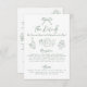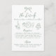 Specifikationskort för Quirky Whimsical Bröllop Sage Grönt-hand plockade. Kortet bröllop i roligt och i det snabba detaljutrymmet har en lekande design med en handdragen buk överst, omgiven av söta små illustrationer som champagneglas, matlagningsartiklar, kakor från bröllop, disko-perfekt från party, bil från ny gifta och bröllop boll. Den ursprungliga paletten har uppdaterats med mjuka demarkeringstangenter, vilket ger en jordig och relaxad grönt samtidigt som charmeringsklimatet bibehålls. I layouten kombineras handskrivet skript med ett enkelt handskrivet teckensnitt, vilket ge det till en avslappnad och snyggtens utseende. Det finns gott om utrymme för all information om bröllop, inklusive mottagningsinformation, attitydriktlinjer, logi, alternativ för transport och utrymme för ytterligare information eller en webbplats för bröllop. Utformningen är helt anpassade, så du kan anpassa texten efter dina behov. Perfekt för par som vill lägga till lite personlighet och roligt till detaljerna kring bröllop. Tillgängligt som utskrivet kort.