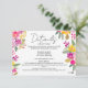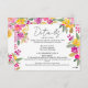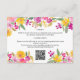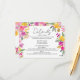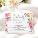 Kortet med vibranta detaljer om bröllop visar handmålade vår- och sommarfärger i levande rosa, gult och gröntar. På framsidan finns viktiga mottagnings- och logikuppgifter, medan baksidan innehåller instruktioner för OSA, alternativ för kostbegäran och en QR-kod för ytterligare information. Perfekt för att göra era bröllop-planer mer eleganta och tydliga.