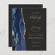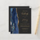 Den lämnat kant i denna formgivning har en marin blå vattenfärgsagat gräns som trimmas med guld faux glitter. Anpassadet kombinerar handskrift, rityta och kursivt typsnitt med guld-färgad på en svart bakgrund. Den omvända sidan ger utrymme för ytterligare bröllop-detaljer på en solid skiffersvart bakgrund.