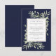 Den här chicen botaniska gästinformationskortet med information om höljet kan vara personlig med dina gästuppgifter och har en delikat vattenfärgsgrönt löv-löv på en marin blå bakgrund. Designad av Thisisnotme©