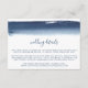 Ett modernt och kreativ bröllop-djurutrymmeskort med en enkel design med en konstnärlig marin blå vattenfärgsborstlinje överst, över en vit bakgrund. Nedan står rubriken "Information om Bröllop" i ett handskrivet teckensnitt. Baksidan är marin blå och kan ändras till valfri färg. Använda dessa unika inhägnadskort för att ge anvisningar och andra viktiga uppgifter som dina gäster kan behöva känna till, t.ex. hotellrum, parkering, pendelinformation osv.