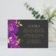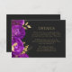 Det här romantiska, moody, mörk blommigt bröllop-detaljkortet har ett gräns av lila blommor som är avstängt med guld faux foliage. Parets namn visas i det klassiska serif-teckensnittet för guld-färgad, med resterande text i kursiv stil, på en baksida som inte är svart.