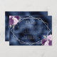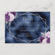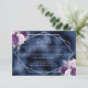 I den här eleganten finns det ett kort för modern bröllop-information med ett silver-geometriskt ram, som är dekorerat med lilac och lila blommor och silver faux-löv från glitter på en marin blå folie. I anpassadet kombineras silver grått med vismisk handskrift och kopparplåt typsnitt. Den marina blå foliebilden upprepas på baksidan.