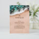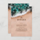 Elegant- och destinationsinformationskort för bröllop med en tropisk sandskam, vinkart hav, romantiska löv handflatan, sträng ljus och en modern detaljmall för bröllop som är lätt att anpassa.