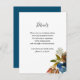 Kortet för den vackra blommigten bröllop har vattenfärgen marin och rost blommor och anpassningsbarna. Baksidan är en djup blått. All text på kortet kan ändras för att uppfylla dina behov. Använda för dina inkvarteringar, speciella anteckningar om bröllop, information om mottagningen osv. Använda mallen som du vill fylla i informationen i. Du kan använda funktionen "Anpassa ytterligare" för att ändra teckensnittet (storlekt, stil, färg) och lägga till mer linjer text, ändra layouten och lägga till text längst bak i inbjudan.