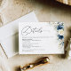 Specifikationskort för marint blått och vitt Bröllop. Den här duschen i snyggt och elegant bröllop har en fantastisk handmålad vattenfärg: marinblått och Vit ros. Sök efter matchande objekt i samlingen Navy Blue och Vit ros.