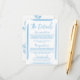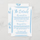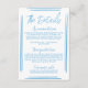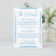 Information om gästinformation om himmel blå bröllop och enkel snyggt. Med vit bakgrund och blå text med vita och vita bokstäver och vintage hand plockade viskig ram. Med hand plockade blå blommönster på baksidan. All information är anpassade som webbplats, transport, logi. Ta den tillsammans med andra produkter från denna klassade hand som tillverkades av retro bröllop-svit.