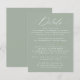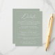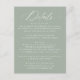 Kortet i bröllop innehåller information om elegant med vit kalligrafi på serensidans grönt, vilket ger ett modernt och snyggt sätt att viktig information med dina gäster. Anpassa kortet med information om bröllop, t.ex. mottagningsinformation, hotellrum och bröllop webbplats, allt med fet vit stil för att få klarhet. Formgivningens enkelhet och elegans gör det till perfekt för både formellt och avslappnad bröllop under vilken säsong som helst. Lägg till det här vackra och funktionella kortet till ditt bröllop-kontor för en sömlös gästupplevelse.