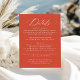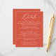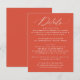 Gör det enkelt för dig att dina uppgifter om bröllop med det här elegant bröllop-kortet för detaljbilagan. Med "Information" från ord i elegant, vit kalligrafi på en fantastisk Verona-orange-bakgrund, erbjuder det här kortet en modern, enkel och sofistikerad utformning. Anpassa den genom att lägga till information om bröllop, inklusive mottagningsinformation, hotellrum och bröllop webbplats, allt med fet vit stil för en slående kontrast. Perfekt för både formell bröllop och avslappnad är detta kort ett perfekt tillägg till bröllop-kontoret under vilken säsong som helst, vilket garanterar att gästerna har all information de behöver i ett format för elegant.