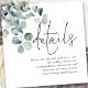 Modern Sage Eucalyptus QR Code Bröllop Detaljer Vackra löv i vattenfärg finns i det lämnat övre hörnet. Lägg till din QR-kod på webbplatsen för bröllop så att dina gäster kan söka igenom och klicka på genom till webbplatsen för bröllop för att se all information. En informell teckenuppsättning i svart för huvudrubriken Information och resten av texten som lätt kan anpassas.